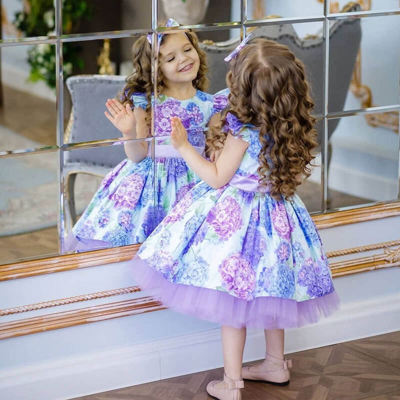 Bei diesem Festkleid hat sich unser Designteam für Violetttöne (die sich in den Blumen, dem Tüll des Unterrocks und den Ärmeln wiederfinden) und Weiß das im gesamten Kleid zu finden ist entschieden. Darüber hinaus sorgen die für dieses Outfit verwendeten Stoffe dafür, dass Ihr Kind an heißen Tagen unvergleichlichen Komfort genießt.